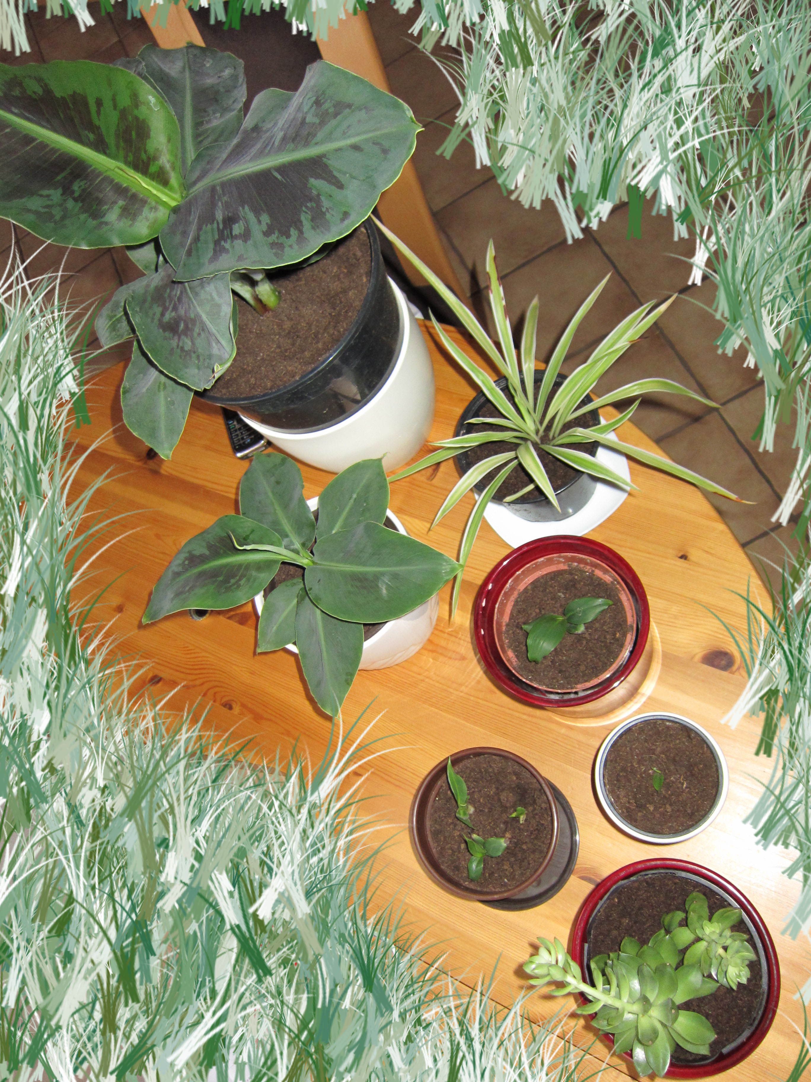 Lange vor mir hergeschoben, aber langsam war es unausweichlich! Große Umtopfaktion am Sonntagabend. Warum ich mir einen Tag mit so viel Wind ausgesucht habe, weiß ich auch nicht, nunja, ruckzuck waren die Erdkrümel weggeweht ;-) Bin gespannt, wann ich wieder ran muss, die Bananenbäume vermehren sich wie die Karnickel ;-) Macht aber wirklich Spaß beim Wachsen zuzuschauen! Bin gespannt, ob auch irgendwann mal ein Banänchen dran hängt. Eine Pflanze fehlt auf dem Bild, die habe ich gleich als Mitbringsel zu einer Kaffeeeinladung mitgenommen.