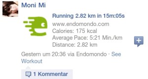 Juchu!!! Nach 3 1/2 Monaten Zwangspause habe ich gestern endlich mal wieder gewagt zu laufen! Es war nicht besonders weit, aber es war ein Anfang! (Auch wenn ich mir mit meiner Hüfte noch nicht so sicher bin…) Bei der Gelegenheit konnte ich auch endlich das Samsung Galaxy SII beim Sport testen. Habe mir dadurch Trainingsuhr, GPS-Gerät und Mp3-Player gespart. Bin mit der Endomondo-App losgelaufen und habe nebenbei Musik aus dem Internet gehört. War zwar ein kleiner Kampf mit den „InEar“-Kopfhörern aber ansonsten super. Die mitgelieferten Kopfhörer sind nicht für meine Ohren gemacht, scheinbar sind meine Ohren zu klein, jedenfalls sind sie mir immer wieder „rausgeploppt“. Aber zum Glück lassen sich ja auch andere Kopfhörer anschließen. Nach dem Laufen habe ich gleich meine Durchschnittsgeschwindigkeit und Laufzeit angezeigt bekommen, sowie die Distanz und genaue Laufroute. Perfekt! Schon im Vorhinein hatte ich geplant das gleich bei Facebook zu posten (geht direkt nach dem Lauf mit der App), da dies kein schlechter Motivator ist, schließlich will man sich mit seiner Laufleistung ja nicht blamieren ;-)