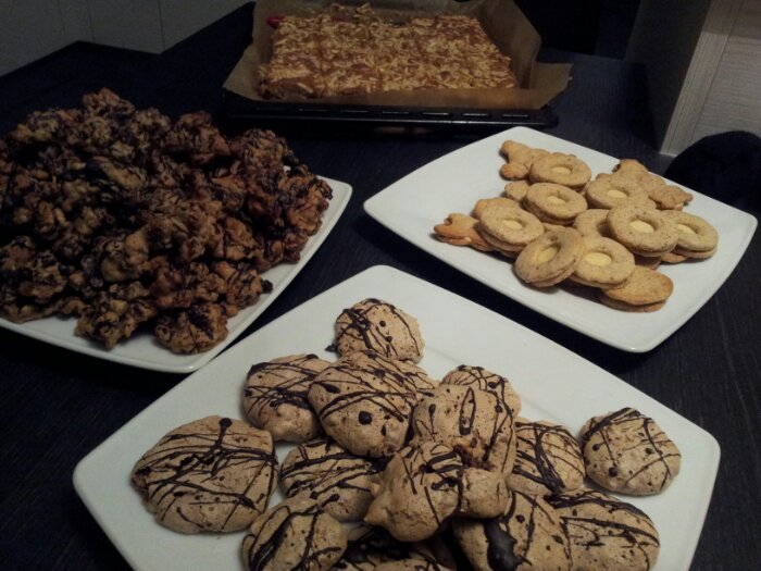 … wird es Zeit Weihnachtsplätzchen zu backen, bei Skamusik und durch die Küche tanzend. Ich glaube so schmecken sie noch viel besser. Dieses Mal gab es gleich vier Sorten auf acht Blechen verteilt. Früchtebrot mit Cranberries, Snickerdoodles (Walnuss, Kirschen, Rosinen in Rum), Witwennester (Eischnee, geröstete Mandeln und Schoki) und Eierlikör-Plätzchen. Sollte bis Weihnachten reichen, zum Nikolaus wurden die ersten schon verteilt.