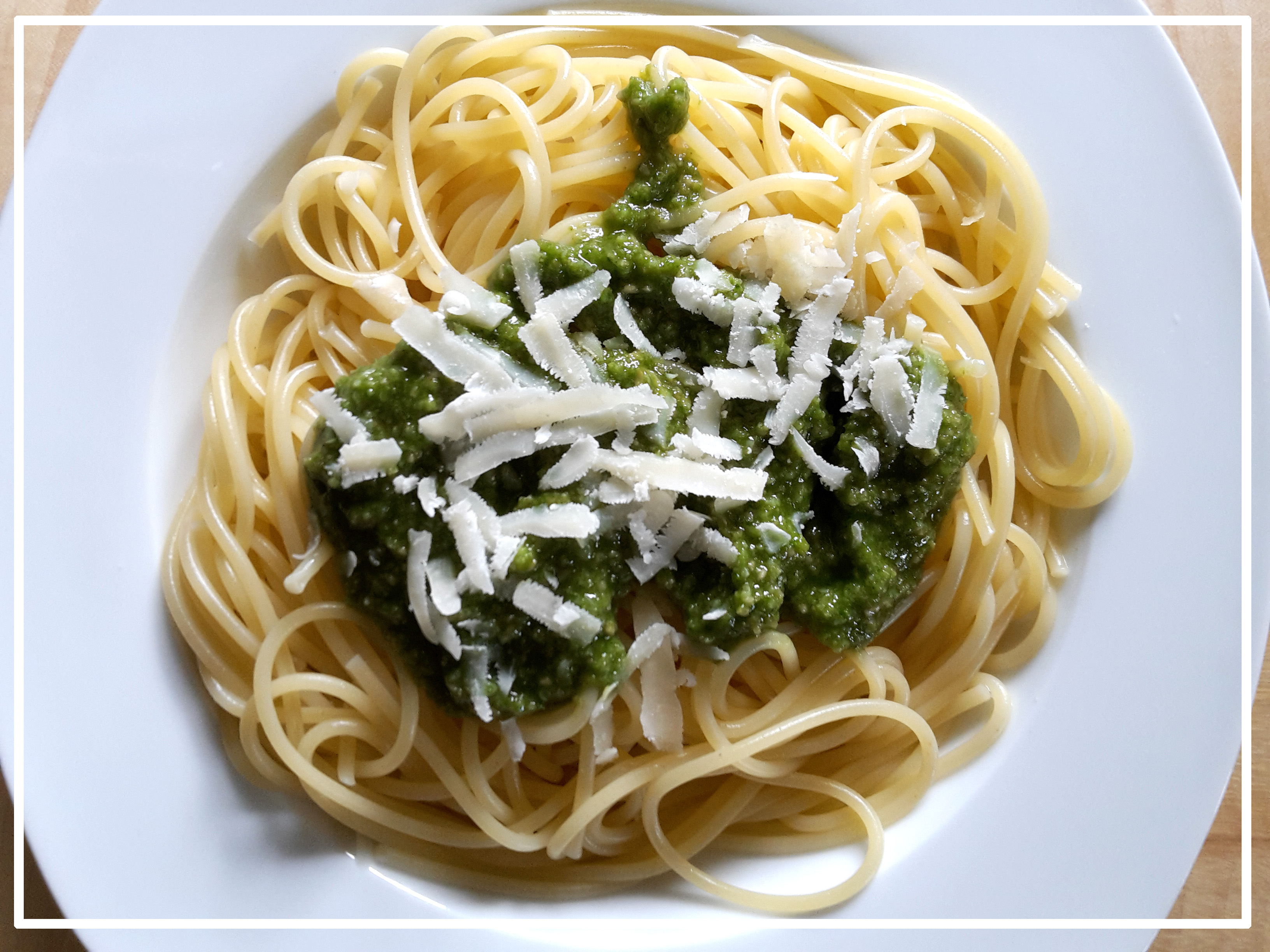 Dann muss man nur noch Nudeln kochen und genießen! (Ich habe übrigens die Pinienkerne durch Sonnenblumenkerne ersetzt, das ist billiger und trotzdem köstlich!