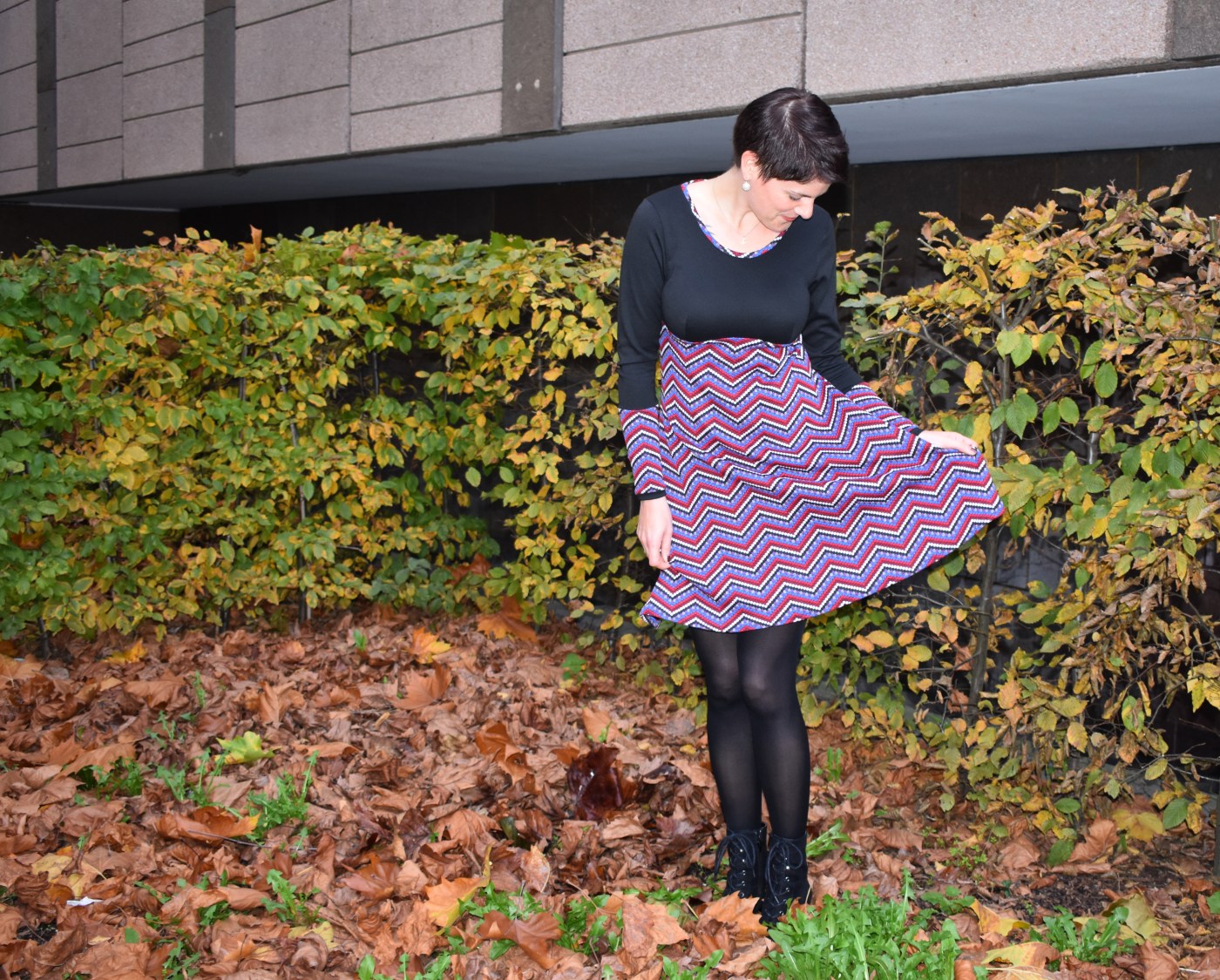 Manchmal gehe ich ohne Kaufabsicht los, sehe einen Stoff und komme einfach nicht daran vorbei. So ging es mir auch mit diesem wunderschönem Zick-Zack-Stoff. Ich sah direkt vor mir, dass es ein Kleid werden sollte, mit schwarz kombiniert. Genauso habe ich es auch umgesetzt, leider habe ich falsch gemessen, worauf das Oberteil nun nicht so richtig sitzt. Die „Unterbrustlinie“ passt nicht so ganz, was mich wirklich ärgert, denn ansonsten ist das Kleid einfach toll und wirklich gemütlich! Aber ich bin ja ganz schlecht darin, Dinge wieder aufzutrennen und nochmal zu nähen…