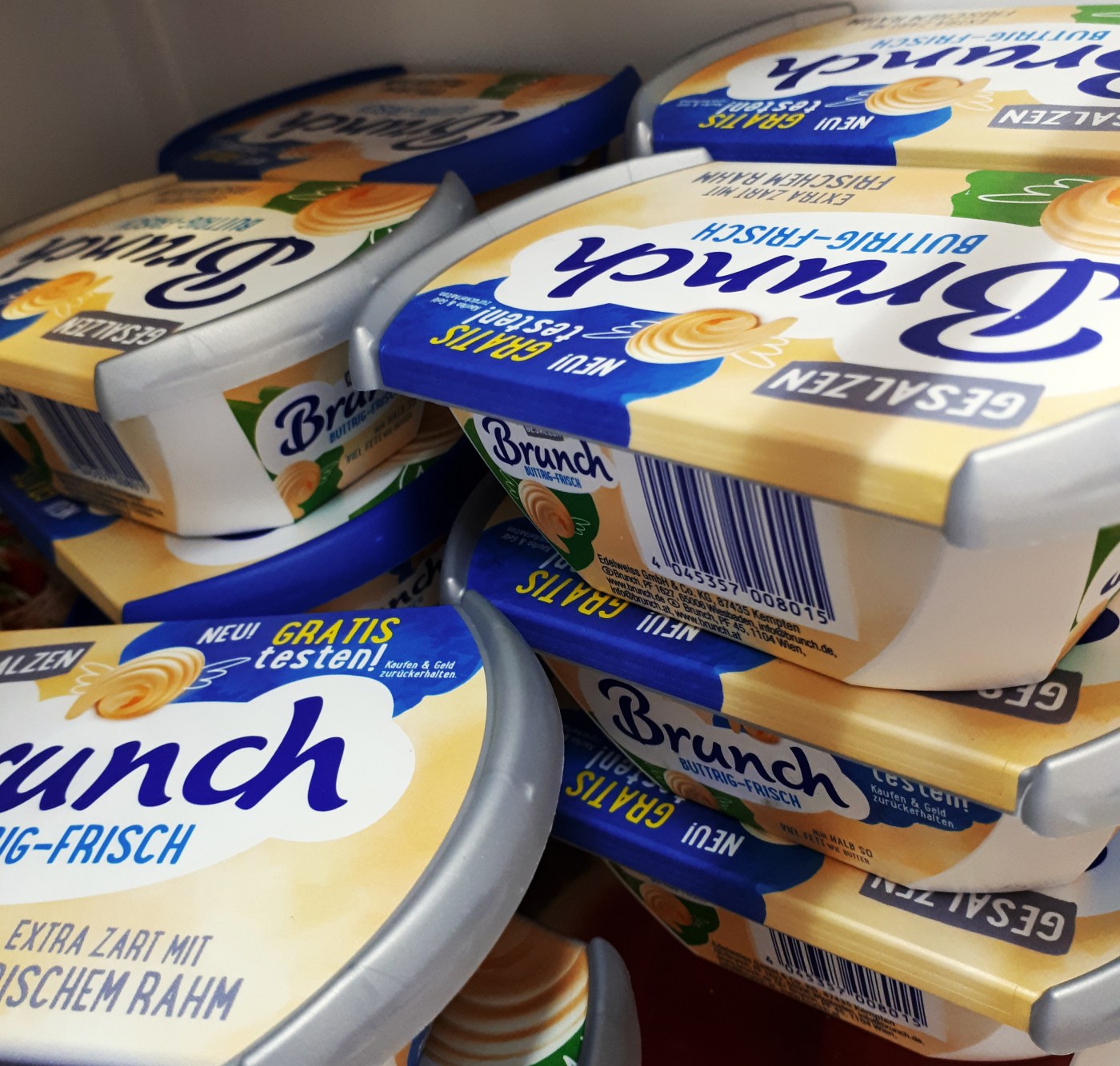 Brunch kennt man ja eher als Frischkäse in vielen verschiedenen Geschmacksrichtungen. Doch nun wurde etwas Neues probiert: Brunch Buttrig-Frisch, welche 36 % weniger Fett als Butter besitzt und immer schön streichzart ist. Diese gibt es in zwei Geschmacksrichtungen, einmal normal z.B. auch zum Backen oder in der Version „gesalzen“, was sich gut unter der Wurst auf dem Brot macht.