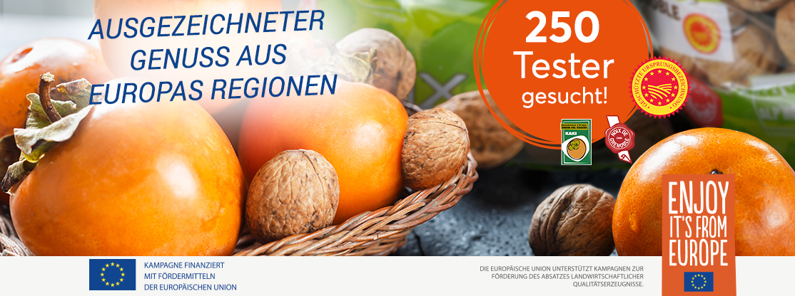 Dir liegt nicht allein die Qualität von Lebensmitteln am Herzen, sondern auch ihre Herkunft? Der neue Brandnooz-Produkttest entführt Dich in die Genuss-Welt aus Europas Regionen und bringt mit EU-Gütesiegel ausgezeichnete Lebensmittel zu Dir nach Hause. Wenn das etwas für Dich ist, dann teste jetzt fruchtige Kakis aus Spanien und köstliche Walnüsse aus Frankreich. Wählen sie Dich als Tester aus, kannst du Dich über 4 Kaki Ribera del Xúquer g.U. sowie 2 je 1 kg große Tüten Walnüsse Noix de Grenoble g.U. freuen, die Dich mit vielen Vitaminen und Nährstoffen lecker durch die kalte Jahreszeit begleiten.