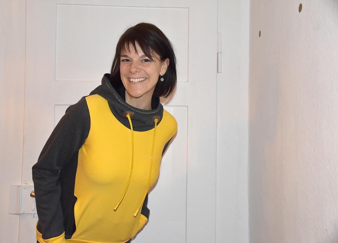Jetzt aber zum Thema!! Ich habe mich für den Hoodie und nicht für den Cardigan entschieden. Außerdem wurde es ein Grau und kein Schwarz als Kontrastfarbe, wie zuerst überlegt, so ist es weniger hart und sieht ein nicht komplett nach BVB aus. Es fühlte sich auch ein wenig eigenartig an, bei zweistelligen Temperaturen einen kuscheligen Sweat anzuschneiden, während man bei allen anderen schon sieht, wie sie ihre Frühjahrs- und Sommermode nähen. Aber wer sagt denn, dass es nicht nochmal kalt wird und auch auf Festivals benötigt man in den kälteren Nächten etwas zum Überziehen. Jetzt habe ich jedenfalls einen ziemlich kuscheligen Hoodie aus einem gelben Sweat von Pepelinchen und einem grauen Stöffchen, von dem ich gar nicht mehr so richtig weiß, wo er herkam. Leider hatte ich Pech mit dem gelben Sweat, da er teilweise verfärbt war. So musste ich ein wenig puzzeln und leider auch gegen den Fadenlauf zuschneiden, weshalb sich meine Eingrifftaschen nun wellen. Das ärgert mich, aber vielleicht kann ich da noch etwas retten.