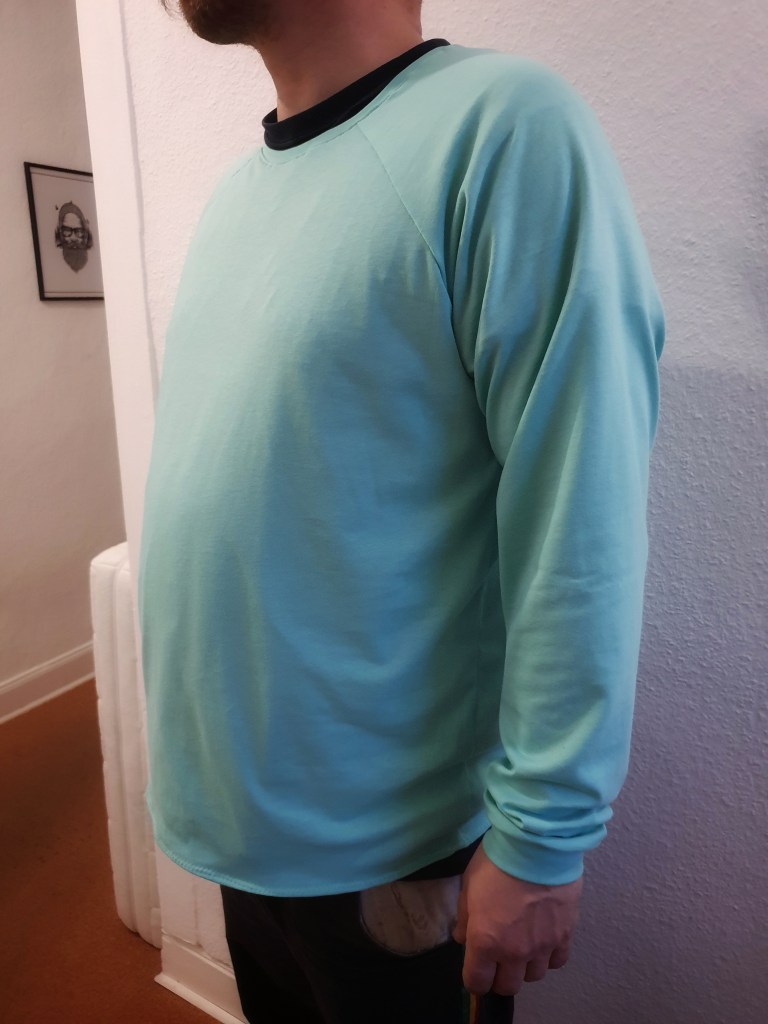 Dieses Jahr wurde mir recht dünner Jersey zugewiesen, davon aber eine ganze Menge. So konnte ich drei Raglan-Shirts im Sinne langer Unterhemden nähen und nutze dafür das neue Schnittmuster von Nähfrosch, nämlich das Raglanshirt SAMA, welches für die ganze Familie gradiert wurde *klick*