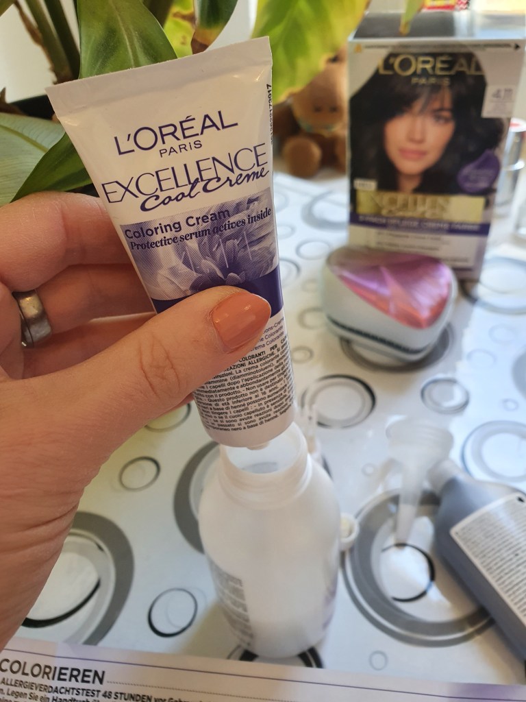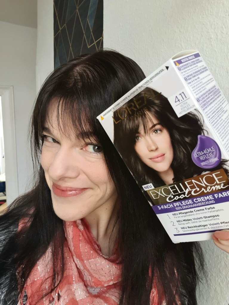 Ich habe meine Haare mit der „Excellence Cool Creme 4.11 Ultra kühles Mittelbraun“ gefärbt. Der Geruch war recht beißend, da assoziiert man direkt „Hilfe! Schädlich!“, aber das lässt sich vermutlich nicht vermeiden. (Ich habe bisher nur getönt und nicht gefärbt). Den Kamm-Applikator fand ich klasse, der hat das Auftragen erleichtert. Ich bin – wie gesagt – nicht ganz so firm, meine langen Haare selbst zu färben. Mit der Farbe bin ich sehr zufrieden. Gefällt mir gut, auch die Nachpflege, die enthalten ist, empfinde ich als positiv (mega Farben ;-)) und dass es noch ein Produkt zusätzlich für mehrere Anwendungen nachher gibt, die den kühlen Farbton erhalten soll: cool!