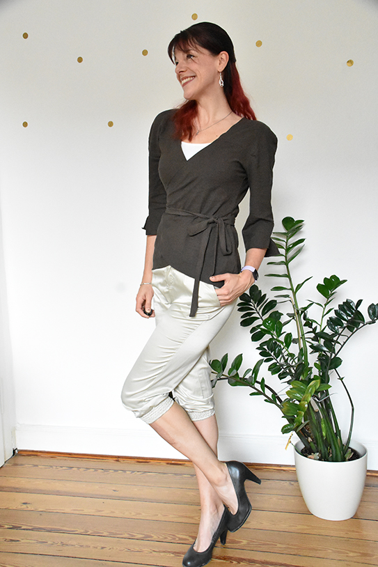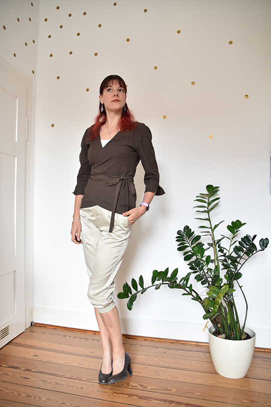 Während ich diesen Blogbeitrag tippe, trage ich gerade die Wicklebluse, schick aber gemütlich im Homeoffice. Als ich den Aufruf zum Probenähen sah, fühlte ich mich herausgefordert. Blusen an sich finde ich ja nicht ganz so einfach, dann noch aus Webware und mit Bindeband? Klar, man wächst an seinen Aufgaben!