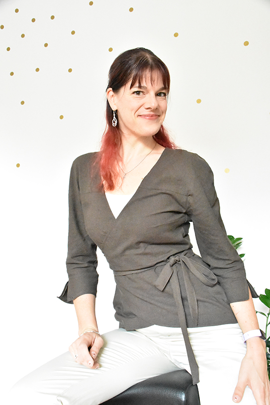Das sagt Jaqueline selbst über ihren neuen Schnitt: „Oceanne ist eine Wickelbluse mit schön abgerundetem Saum. Du kannst einen schmalen Kragen nähen oder aber dich für die Variante ohne Kragen entscheiden.